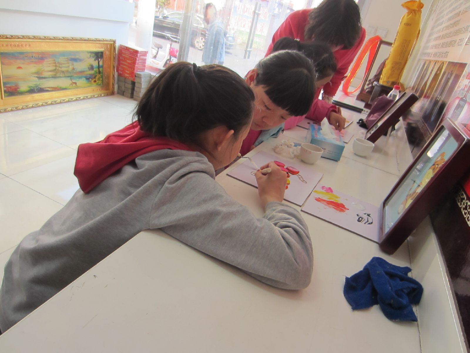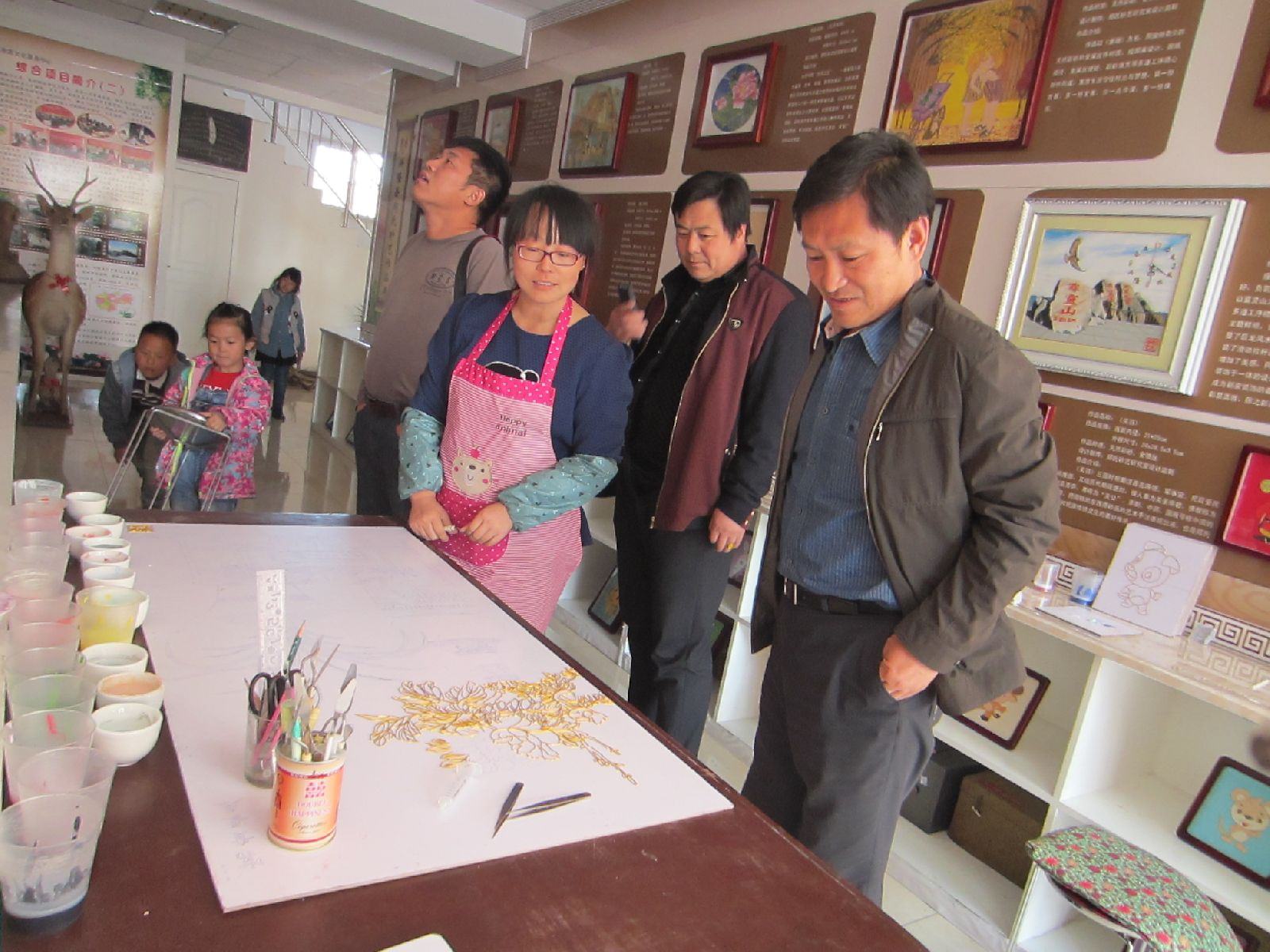 楊書記在體驗館和員工交流、看小朋友制作砂畫